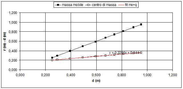 Lo scopo di questa fase della prova consiste nel risalire alla massa del disco mobile per via analitica. Per fare ciò abbiamo tracciato in grafico i valori di r in funzione di quelli di d. Successivamente tramite le opportune funzioni di EXCEL abbiamo ricavato il valore del coefficiente angolare della retta di tendenza per poi risalire al valore della massa andandolo a confrontare con quello teorico. Di seguito viene riportato il suddetto grafico.