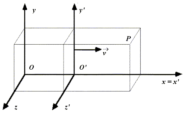 Riferiti rispettivamente alle origini O e O', di cui O' mobile rispetto ad O di moto rettilineo uniforme con velocità vo . Si supponga che gli osservatori solidali ad O e O' siano dotati di 2 orologi per la misura dei tempi sincronizzati tra loro in modo che, per esempio, quando O coincide con O' entrambi gli orologi segnino zero. Non è restrittivo supporre che gli assi x e x' siano sovrapposti e scivolino l'uno rispetto all'altro, in modo che v sia parallela ad essi, mentre gli altri (y e y', z e z') restano paralleli fra di loro. Si considera un certo evento fisico che avviene in un punto P con coordinate (x,y,z) e (x',y',z') rispetto ad O e O' e negli istanti t e t' misurati dai 2 osservatori: