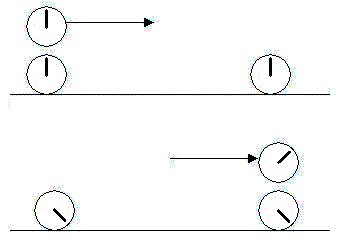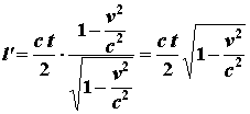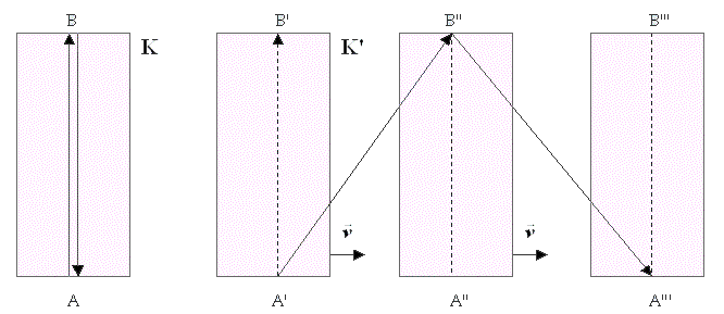 Per l'osservatore solidale con l'orologio in moto relativo, diciamo nel sistema K', il raggio di luce continua a riflettersi fra i due specchi, perpendicolarmente ad essi. Ma per un osservatore del sistema K , solidale con l'orologio che per noi é in quiete, il moto del raggio di luce si compone con quello traslatorio dell'orologio, e si ha la traiettoria diagonale della figura: non più AB, ma A'B'' e B''A'''. Ora, sia t il tempo misurato dall'orologio a luce in K per percorrere il tratto AB, e t' il tempo misurato in K' per percorrere uno spazio uguale. É chiaro che t < t', essendo AB A''B'' < A'B'' (il cateto é minore dell'ipotenusa); ed essendo la velocità della luce costante in ogni sistema di riferimento, risulta: