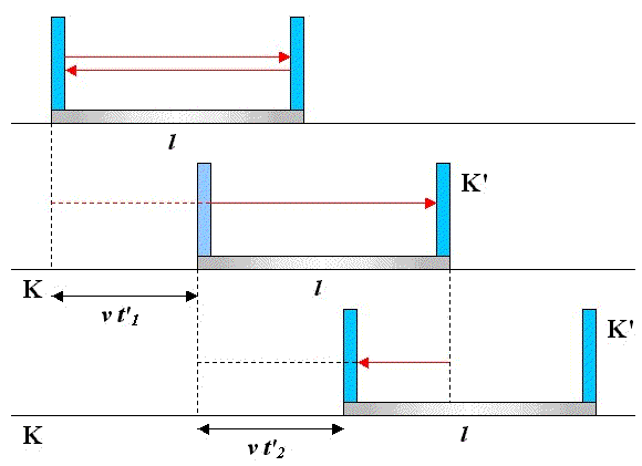 riferiti rispettivamente alle origini O e O', come abbiamo già fatto precedentemente. Se K' si muove rispetto a K con velocità v, per la contrazione delle lunghezze sarà: