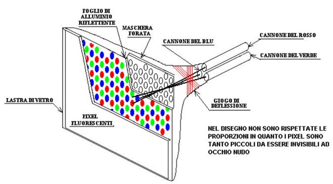 Ci sono quindi tre catodi (1) con tre sistemi di focalizzazione (complessivamente detti cannoni elettronici), che generano un fascio per ciascun colore (2) (in realtà i fasci sono invisibili, la corrispondenza con il colore dipende esclusivamente da quale fosforo viene colpito).