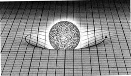 Mentre per Newton, una stella tiene un pianeta in orbita grazie ad un non ben identificato "guinzaglio" gravitazionale, che istantaneamente si propaga ed "afferra" il pianeta, per Einstein la gravità coincide cioè con la trama stessa del cosmo, ed il pianeta si trova a "rotolare" nell'incavo spaziotemporale generato dalla massa della stella.