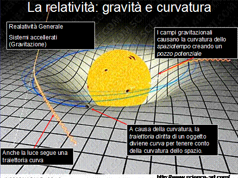 Nel paragrafo precedente abbiamo parlato della teoria della relatività ristretta e delle differenze con l'approccio galileiano quando la velocità dei corpi in un sistema inerziale si approssima a quella della luce. Adesso passiamo alla teoria della relatività generale ed alle differenze con la teoria della gravitazione universale quando un campo gravitazionale assume dimensioni molto più grandi di quello esistente tra la terra e la luna od il sole e la terra .