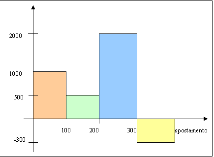 Il grafico di figura 5.2.1 suppone che la Ferrari in questione, dopo i primi cento metri nei quali la forza era costante a 1000N, si sia spostata con la seguente modalità: nei successivi 100 metri la forza è scesa a 500N, per altri 100 metri è salita a 2000N, mentre negli ultimi 100 metri l'auto ha frenato con una forza (negativa) di 300N. Quale sarà il lavoro totale compiuto nei 400 metri dalla forza non costante?