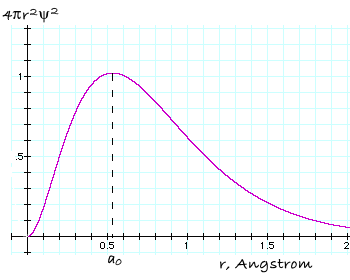 Funzione di distribuzione radiale in funzione della distanza dal nucleo, per l'orbitale 1s dell'idrogeno. La probabilità di trovare l'elettrone è massima per r=ao ed è zero sul nucleo, dove il numero degli elementi di volume diventa infinitamente piccolo in confronto al numero di essi associato con valori di r maggiori. |
