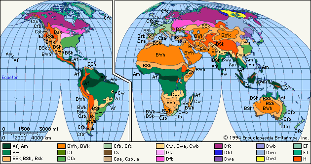 Il geofisico e meteorologo di origine russa Wladimir Köppen ha proposto una suddivisione dei climi in 5 classi climatiche contraddistinte dalle prime lettere dell'alfabeto nell'ordine in cui a grandi linee si incontrano spostandosi dall'equatore verso i poli. A loro volta tali famiglie possono essere suddivise in 11 tipi climatici principali, che comprendono numerosi tipi secondari o sottotipi.