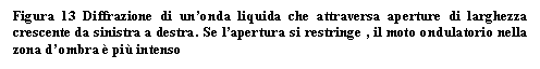 Innanzitutto consideriamo un esperimento: nella vaschetta delle onde liquide inviamo un'onda piana contro una larga apertura. Al di là dell'apertura l'onda procede quasi indisturbata e la larghezza del treno d'onde è grande circa come l'apertura stessa. L'ostacolo produce un'ombra ben riconoscibile. Solo ai lati dell'apertura si ha l'impressione che le superfici d'onda tendano a incurvarsi, come se delle deboli onde circolari nascessero dai bordi dell'apertura. Se stringiamo l'apertura quest'effetto diventa più appariscente. Quando poi l'apertura diventa larga come la lunghezza d'onda, allora al di là dell'ostacolo si propaga un'onda circolare e non si nota più nessuna ombra.
