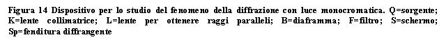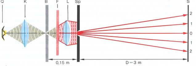Per ottenerlo poniamo davanti alla lampada ad arco un diaframma con una fenditura e un filtro rosso. Otteniamo così una sorgente luminosa rossa a forma di riga. Davanti a questa sistemiamo una lente convergente, in modo che il fuoco cada esattamente sulla fenditura del diaframma. Ora dalla lente esce un fascio di raggi paralleli rossi con i quali illuminiamo la fenditura regolabile e ne raccogliamo l'ombra su uno schermo lontano. Il dispositivo sperimentale si presenta come illustrato in figura.