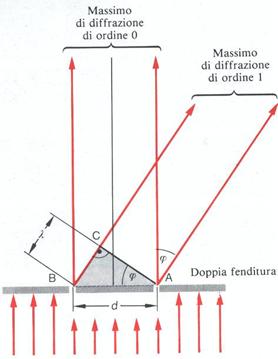 in seguito alla diffrazione da una fenditura doppia si ottengono righe chiare, dette massimi di diffrazione di ordine k, la cui direzione è individuata dalla formula precedente.