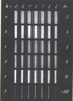 La formula precedente ci dice che la distanza tra i massimi di diffrazione cresce se avviciniamo le fenditure. Possiamo inoltre aumentare l'intensità dei massimi di diffrazione se facciamo sovrapporre non solo due treni d'onda ma un gran numero di questi. Sarà quindi opportuno usare molte fenditure disposte il più vicino possibile fra loro.