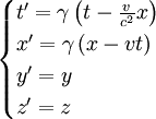Scritte prima del lavoro di Einstein, le trasformazioni di Lorentz descrivono le modifiche da apportare alle equazioni galileiane della relatività classica. Le trasformazioni di Lorentz sono trasformazioni lineari con cui è possibile ricavare, a partire dalle coordinate nel sistema di riferimento S (t,x,y,z), le coordinate rispetto al sistema di riferimento S' (t',x',y',z') di un evento nello spaziotempo. Senza perdere di generalità, si può assumere che S' abbia i tre assi spaziali paralleli a quelli di S, che il sistema S' si muova con velocità v lungo l'asse x di S e che le origini dei due sistemi di riferimento coincidano per t' = t = 0.