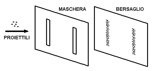 È evidente che sul muro giungeranno solo i proiettili in corrispondenza dei due fori, mentre gli altri verranno fermati dalla maschera. In definitiva, i proiettili che colpiranno il bersaglio formeranno due rettangoli stretti e lunghi che saranno la 'proiezione' sul bersaglio dei due fori della maschera