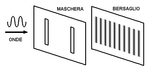 Ora ripetiamo l'esperimento con delle onde al posto dei proiettili, per esempio delle onde sonore. In tal caso le onde colpiranno il bersaglio non soltanto in corrispondenza dei due fori, ma anche in altre parti del muro; se si potessero visualizzare le parti colpite con maggiore e minore intensità, vedremmo una tipica figura a frange detta figura di interferenza, che si estende ben oltre la proiezione delle fenditure. Ciò è dovuto ad un fenomeno ondulatorio detto interferenza: grazie a tale fenomeno, le onde possono colpire regioni del bersaglio che sarebbero irraggiungibili per i proiettili.