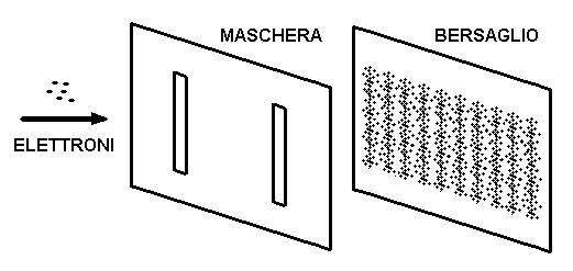 La sorgente emette elettroni distinti, cioè particelle e non onde, e quindi ci aspettiamo di avere la stessa situazione che si presentava nel caso dei proiettili: gli elettroni dovrebbero colpire solo due zone rettangolari in corrispondenza delle fenditure, invece otteniamo una figura di interferenza come nel caso delle onde. Eppure non si tratta di onde, ma di particelle distinte.