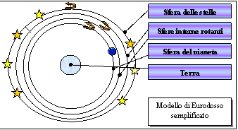 La Terra era al centro di tale sistema, il che supponeva che la Terra fosse al centro dell'universo. Sulla sfera più esterna stava la sfera delle stelle che seguiva un'orbita puramente rotatoria. Tra la sfera delle stelle e la Terra, sussistevano diverse sfere, sulle quali erano posti i pianeti. Ciascuna sfera era ricollegabile a quella più esterna ad essa, e partecipava in maniera diretta al moto dei pianeti.