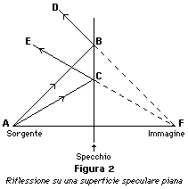 Una superficie di separazione ben levigata può comportarsi come uno specchio e produrre un'immagine riflessa. Ad esempio, nella figura 2, la sorgente di luce è l'oggetto A, e i due raggi che colpiscono lo specchio in B e C sono riflessi con direzioni BD e CE. A un osservatore posto davanti allo specchio, essi sembrano provenire dal punto F, dietro lo specchio. Dalle leggi della riflessione segue che i segmenti CF e BF formano con la superficie riflettente angoli identici a quelli formati rispettivamente da AC e AB. Perciò, l'immagine formata da uno specchio piano sembra trovarsi dietro la superficie riflettente, alla stessa distanza a cui si trova l'oggetto reale.