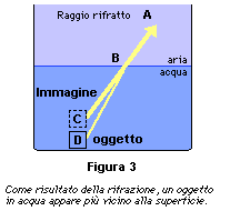 Questo fenomeno spiega perché un oggetto immerso in acqua appare più vicino alla superficie libera del liquido di quanto non sia realmente. Nella figura 3, la direzione obliqua del raggio è scelta solo per facilitare la spiegazione. Il raggio DB, passando nell'aria, è deviato con un angolo maggiore rispetto alla normale, e giunge in A. Perciò, a un osservatore in A, l'oggetto appare come se fosse situato nel punto C, all'intersezione tra il prolungamento di AB e la verticale passante per D.