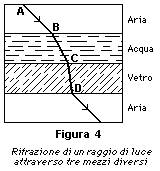 Il cammino di un raggio luminoso attraverso strati paralleli di mezzi diversi è rappresentato in figura 4 (l'indice di rifrazione dell'acqua è minore di quello del vetro). Poiché il primo e l'ultimo strato sono composti dalla stessa sostanza, il raggio uscente è parallelo a quello entrante, ma non allineato con esso.