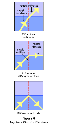Poiché un raggio si allontana dalla direzione normale quando penetra in un mezzo meno denso e la deviazione aumenta all'aumentare dell'angolo di incidenza, deve esistere un angolo di incidenza per il quale l'angolo di rifrazione è uguale a 90° e il raggio rifratto si propaga lungo la superficie di separazione dei mezzi. Tale angolo è detto angolo critico. Se l'angolo di incidenza è maggiore dell'angolo critico, il raggio incidente viene totalmente riflesso (riflessione totale). Le tre immagini di figura 6 mostrano rispettivamente un caso ordinario di rifrazione, la rifrazione con angolo critico di incidenza e la riflessione totale.