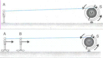 Nel tempo T durante il quale S compie un intero giro intorno a M, l'osservatore A sarà avanzato di un tratto AB verso M. Perciò, ora, la luce che S emette nell'istante in cui ricompare dalla parte posteriore di M impiegherà, per ritornare ad A, un tempo inferiore a quello che essa impiegava a compiere la stessa operazione quando A era fermo rispetto a M. Misurata la differenza fra questi due tempi e misurato il tratto AB, si può determinare facilmente la velocità della luce.