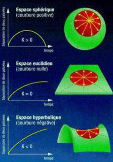 I matematici hanno individuato enti geometrici che sono spazi omogenei con curvatura costante. L'omogeneità e l'isotropia dell'Universo (principio cosmologico) dovrebbe manifestarsi solo in un Universo la cui curvatura non varia né con la posizione né con la direzione ma in funzione solamente del tempo. Sono possibili tre geometrie: uno spazio sferico con curvatura positiva è finito, uno spazio euclideo con curvatura nulla o iperbolico con curvatura negativa entrambi infinitamente estesi (gli analoghi bidimensionali di queste geometrie sono la sfera, il piano e la sella).