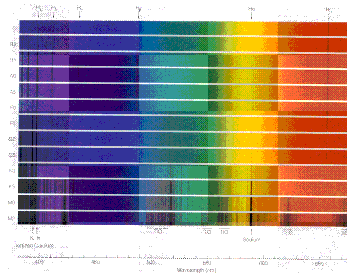 Lo spettro di una stella e' appunto uno spettro a righe di assorbimento. Sotto certe ipotesi, la parte continua di questo spettro può essere approssimata con quello di un corpo nero di temperatura pari a quella della superficie della stella, anche se a rigore una stella non e' un emettitore perfetto e anche se non possiede una superficie fisica ben definita. In astrofisica una stella viene caratterizzata da un 'colore' e da una 'temperatura superficiale' a seconda della forma del suo spettro: questo viene confrontato con uno spettro di corpo nero, e una volta trovato quello che più si avvicina a quello della stella, si attribuisce a questa la stessa temperatura del corpo nero. Il colore e' determinato dalla regione dello spettro nella quale l'intensità della luce e' massima; le stelle hanno temperature superficiali di qualche migliaio o poche decine di migliaia di gradi, ed emettono la massima potenza nella regione ottica dello spettro. Il Sole emette al massimo di intensità nella regione gialla della banda ottica, perciò la sua temperatura superficiale e' stata stabilita in 5780 gradi Kelvin.