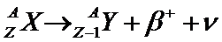 -Se un nucleo ha troppi pochi neutroni, allora nel processo di decadimento un protone si trasforma in un neutrone con l'emissione di un positrone (particella beta positiva). I positroni sono particelle con la massa di un elettrone e una carica positiva. Essi non hanno vita lunga in quanto, appena colpisce un elettrone, essi si distruggono a vicenda generando due fotoni di radiazione gamma chiamati fotoni di radiazione annichilente.