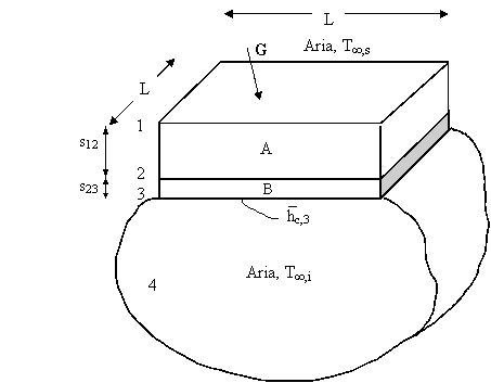 Es. 14 In relazione allo schema rappresentato in figura e ai dati riportati, ipotizzando che l'area di scambio sia quadrata e che la superficie 4 si affacci su un ambiente molto vasto con pareti isoterme alla temperatura Tp, si calcolino, nell'ipotesi di stazionarietà e di monodimensionalità: