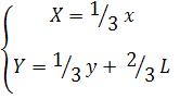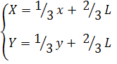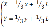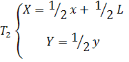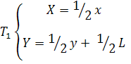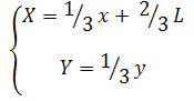 Ora cerchiamo le trasformazioni geometriche che, applicate al frattale, lo trasformano nelle cinque copie che ho individuato. Abbiamo cinque copie e di conseguenza cerchiamo cinque trasformazioni. Si tratta di cinque omotetie[1] di ragione 1/3 poiché la figura diventa un terzo di quella iniziale. Poi occorre comporle con opportune traslazioni . Per ottenere un'espressione analitica delle trasformazioni, occorre fissare un opportuno sistema di riferimento. Per semplicità supponiamo che il frattale sia costruito dentro il quadrato di lato L (il lato della scatola frattale) e l'origine sia posta nell'angolo a sinistra in basso.