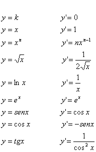 La tabella non è completa ma include le derivate prime delle principali funzioni elementari.