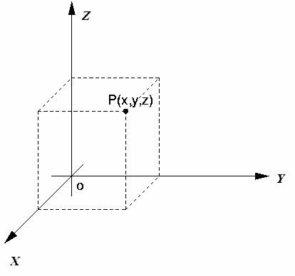 In figura si vedono tre rette orientate incidenti ortogonalmente tra loro in un punto. Vogliamo trovare una maniera efficace di esprimere la posizione di un punto rispetto a questi tre assi, e il sistema è il seguente: le coordinate di un punto saranno una misura della distanza percorsa dal punto stesso in una direzione parallela ai tre assi x, y, z rispetto alla loro origine. Un'altra possibilità è di interpretare ogni coordinata di un punto come la minima distanza del punto rispetto ai piani individuati dagli assi coordinati a due a due, cioè la distanza misurata su una retta perpendicolare (o normale) ai piani; stando così le cose, la coordinata x è la misura della distanza del punto dal piano yz, e via dicendo.