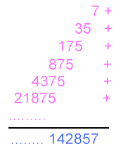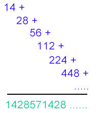 In questo metodo si parte scrivendo 14 in alto a sinistra e poi moltiplicando sempre per 2 e scrivendo il numero successivo spostato di due posti verso destra. La somma da una serie infinita di 142857
