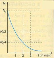 Quest'ultima relazione esprime proprio la legge del decadimento radioattivo, la quale mostra che, partendo da N0 atomi di un elemento radioattivo con costante di disintegrazione l, il numero N di atomi non ancora decaduti decresce esponenzialmente all'aumentare del tempo t (l'andamento di N(t) si può ben vedere dal grafico riportato qui sotto, dove il tempo t è stato espresso in mesi, a causa della lunga durata dei processi di decadimento naturale).
