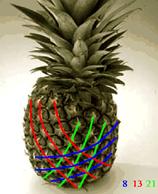 Nell'ananas ognuna delle squame appartiene a tre spirali diverse, come mostrato in figura: quelle evidenziate dal colore verde sono le 21 spirali che salgono ripidamente da sinistra verso destra, nella stessa direzione ma con angolazione minore le 8 spirali in blu. In colore rosso vediamo le 13 spirali da destra verso sinistra. I numeri di spirali presenti sono, nella maggioranza di questi frutti, i numeri della successione di Fibonacci.