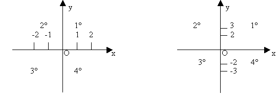 Siano date nel piano, due rette orientate, perpendicolari x e y, che diremo asse x e asse y e sia scelto un verso per ciascuna delle due, come positivo, da sinistra verso destra per il primo asse e come positivo dal basso verso l'alto per il secondo. Il loro punto di intersezione O si chiama origine degli assi; le due rette dividono il piano in quattro angoli detti quadranti: primo, secondo, terzo e quarto.