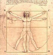 Leonardo dell'uomo di Vitruvio in cui una persona è inscritta in un quadrato e