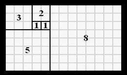 I numeri di Fibonacci possono essere usati per tracciare opportuni quadrati. Cominciamo con due piccoli quadrati di lato 1 uno vicino all'altro, quindi sopra di questi tracciamo un quadrato di lato 2 (=1+1). Possiamo adesso tracciare un nuovo quadrato, che tocca sia il quadro di lato 1 che l'ultimo di lato 2 ( così avente lat i 3) ; quindi un altro che tocca entrambi rettangoli di lati 2 e 3 ( che ha adesso lato 5). Si può così continuare aggiungendo quadrati attorno alla figura, ogni nuovo quadrato avente un lato che ha una lunghezza pari alla somma dei lati dei due quadrati più vicini.