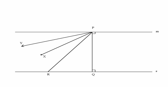 Come possiamo allora accertare che esistono parallele del secondo tipo? Qui entra in gioco l'assioma di continuità. Quella seguente è l'idea intuitiva: consideriamo una semiretta PS della retta m e consideriamo varie rette tra PS e PQ. Alcune di queste semirette, come PR , intersecano s, altre, come PY, no. Un'argomentazione di continuità mostra che quando il punto R si allontana indefinitamente dal punto Q rimanendo su s, PR si avvicina ad una certa semiretta limite PX che non incontra s. La semiretta PX è limite nel seguente senso: qualsiasi semiretta tra PX e PQ interseca s, mentre qualsiasi altra semiretta PY tale che PX è tra PY e PQ, non interseca s. La semiretta PX può essere chiamata semiretta parallela limite sinistra a s per il punto P. Allo stesso modo, c'è una semiretta parallela limite destra dal lato opposto di PQ.