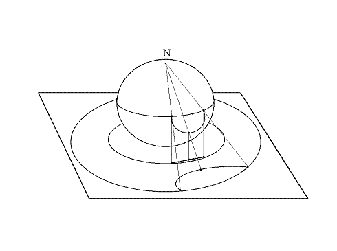 L'incidenza e lo stare tra hanno l'abituale interpretazione euclidea. Per stabilire l'isomorfismo con i modelli precedenti, si sceglie un punto E sull'equatore della sfera della figura precedente e sia p il piano tangente alla sfera nel punto diametralmente opposto ad E. La proiezione stereografica da E su p applica l'equatore in una retta di p e l'emisfero inferiore nel semipiano inferiore determinato da questa retta. Si noti che i punti di questa retta sono punti ideali. Tuttavia manca un punto ideale: il punto E si perde nella proiezione stereografica. Si immagina perciò un punto ideale all'infinito ( ) che corrisponda ad E; esso è l'estremo comune di tutte le semirette verticali.