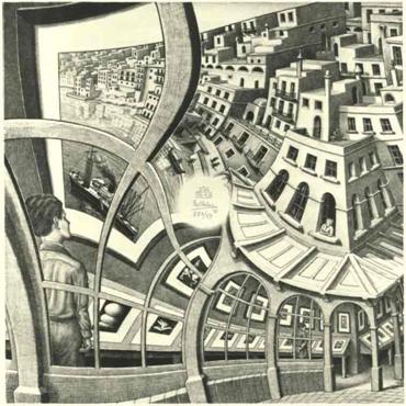 Ma la stampa più ingegnosa può essere considerata: "Esposizione di Stampe" (1956). Giudicando quest'opera secondo i canoni tradizionali dell'estetica, si potrebbero trovare una quantità enorme di difetti. Ma quello che è valido in tutta l'opera di Escher qui è esaltato all'ennesima potenza. Egli ha raggiunto in quest'opera il limite della sua perspicacia e della possibilità di espressione. In quest'immagine una persona si trova all'interno di una galleria d'arte e sta osservando una stampa raffigurante una città marittima che, lungo i portici, ospita un negozio. Quel negozio è una galleria d'arte al cui interno si trova una persona che sta osservando una stampa raffigurante una città marittima Escher è tornato in qualche modo sul suo soggetto; la persona è sia nell'immagine che al di fuori di essa. Questo effetto è stato ottenuto grazie ad una griglia che l'artista creò in preparazione a quest'opera.