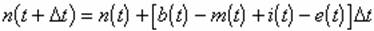 dove: n(t) è il numero di individui al tempo t; b(t) è il tasso di natalità; m(t) è il tasso di mortalità; i(t) è il tasso di immigrazione; e(t) è il tasso di emigrazione e Dt rappresenta l'intervallo temporale.