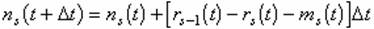 dove: ns(t) è il numero degli individui dello stadio s al tempo t; t è l'intervallo temporale; rs-1(t) è il tasso di reclutamento allo stadio s degli individui dallo stadio s-1 al tempo t; rs(t) è il tasso di sviluppo degli individui dello stadio s al tempo t e ms(t) è il tasso di mortalità dello stadio s.
