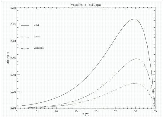 Nel grafico sottostante viene riportata la velocità di sviluppo per gli stadi di uovo, larva e crisalide.
