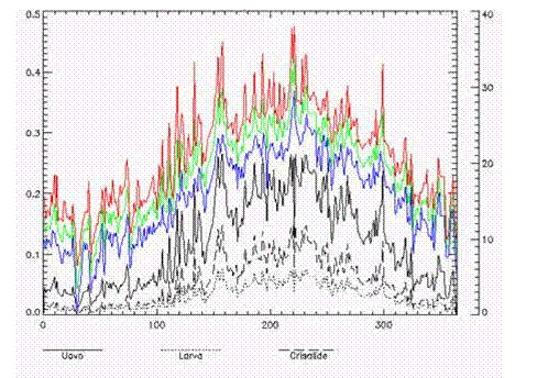 Inoltre se si rapporta, ad esempio, il numero di uova rilevate in campo con la percentuale di ovideposizione simulata dal modello in quel momento, si riesce a ottenere un'informazione più precisa sul livello di infestazione che ci si può aspettare.