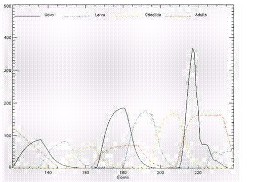 Sono riportati i diversi stadi di uovo, larva crisalide ed adulto. Dal grafico si può notare come la Lobesia parta inizialmente dallo stadio di adulto con 125 unità. Successivamente si sviluppa lo stadio di uovo, dal giorno 120 al giorno 140. Con l'inizio della formazione delle larve si ha una diminuzione nella concentrazione di uova dovuta al trasferimento tra le due classi in modo tale che nei giorni 140-150 troviamo essenzialmente delle larve. Successivamente si formano le crisalidi (giorni 150-170) e successivamente si riparte con lo stadio di adulto.