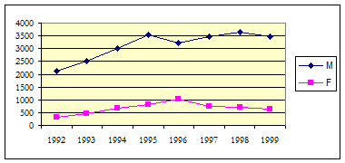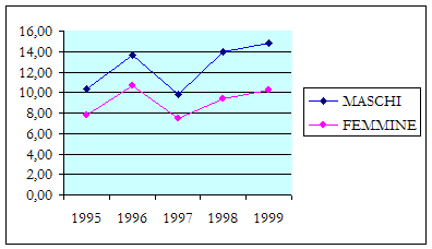 L'aumento delle donne condannate rispetto al totale delle denunciate, per cui si passa dal 31,34% del 1995 al 57,94.% del 1999, è di gran lunga maggiore rispetto all'aumento delle condanne maschili; tale realtà ci mostra come, negli anni considerati11, non vi sia stato un atteggiamento di particolare indulgenza né refrattarietà alla condanna da parte dei giudici nei confronti del sesso femminile, anzi sembra proprio che il sistema giudiziario abbia adottato un comportamento contrario ossia di maggior severità.