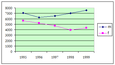 Se osserviamo invece la tabella 7 notiamo come le condannate per furto nel 1995 erano in percentuale maggiore rispetto ai maschi, tale differenza è andata assottigliandosi fino ad un pressoché ugual tasso del 18% nel 1999. Troviamo maggiori condanne femminili anche per il reato di truffa, ma il delitto per cui la prevalenza percentuale è più rilevante viene individuato nell'emissione di assegni a vuoto, rispetto al totale dei condannati secondo il genere le donne vengono condannate per il suddetto reato sempre il 10% e più degli uomini.