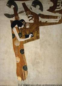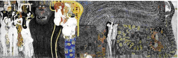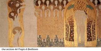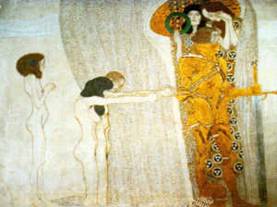 Klimt realizzò il Fregio di Beethoven nel 1902 , come parte integrante dell'allestimento della 14 mostra della Secessione. Vi ha rappresentato , in una serie di monumenti simbolici che si snodano su tre pareti , la ricerca umana della felicità , appagata grazie all'arte. Nella prima scena " Le suppliche del debole genere umano" incarnato da tre figure nude rivolte alla forza , impersonata da un cavaliere in armatura , e a Compassione e ambizione, che prendono la forma delle due donne poste alle sue spalle. Il cavaliere, dall'espressione decisa e concreta , muove un passo in avanti e impugna la spada , accettando la missione. Nelle prime posizioni del fregio si colgono già le costanti dell'intera opera: il suo carattere molto ornamentale e l'importanza assunta dalla linea di contorno .