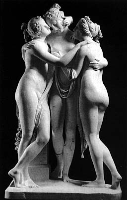 Il gruppo delle tre Grazie era uno dei temi più in voga nel periodo neoclassico, ed ovviamente non poteva mancare nel repertorio di Antonio Canova. Le tre figure di Aglaia, Eufrosine e Talia costituivano le protettrici degli artisti, in quanto da loro proveniva tutto ciò che vi è di bello nel mondo umano e naturale. Egli le raffigura nella posizione più canonica, ovvero abbracciate e disposte a circolo. Sono nude, così come le ritroviamo nella tradizione ellenistica, e vengono rappresentate dall'artista nella classica posizione a chiasmo. L'incrociarsi delle membra serve qui a dare un molle abbandono alle figure che, nel sostenersi a vicenda, formano quasi un unico gruppo di affetti e sensualità corrisposte. L'immagine è quindi concepita come esaltazione di perfezione e bellezza, sommi canoni estetici per il gusto neoclassico.