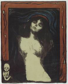 Bene e Male sono due Assoluti. Su questo non ci piove. L'arte è da sempre considerata forma di espressione privilegiata di valori profondi, connessi all'essenza delle cose e al noumeno. Per questo bene e male non possono prescindere da essa (si pensi, ad esempio, al valore dato all'arte da Schelling, secondo cui essa è espressione dell'Assoluto stesso). Fin dall'antichità l'arte è penetrata dall'irrazionale, dal dolore e dal male: la Menade danzante di Skopas, colta in preda a furori dionisiaci, gli affreschi romani della Villa dei Misteri a Pompei, in cui è rappresentata la fustigazione di una giovane donna, i diavoli e le figure mostruose degli affreschi medievali, che dovevano essere di monito ed insegnamento per il popolo illetterato, ne sono ottimi esempi. Tuttavia è con l'Espressionismo tedesco che la rappresentazione del male, il quale ora è connesso all'incertezza del futuro, alla solitudine umana, all'incombere della morte, all'angoscia esistenziale e alla disumanizzazione della società borghese, diventa il grido disperato di quegli artisti che non riescono più a non reagire di fronte alla disgregazione dell'Io e della civiltà. Se con l'Impressionismo era la realtà esterna ad imprimersi nella coscienza dell'artista, ora è l'anima dell'artista a plasmare la realtà in una sorta di correlativo oggettivo. L'arte espressionista è un'arte dura, dai colori violenti e le forme spigolose, in cui la soggettività dell'artista prende il sopravvento sul mondo circostante, rappresentato attraverso il filtro delle nevrosi e delle angosce individuali. L'Espressionismo è profondamente radicato in una società dominata dalle lotte di classe, dalla disoccupazione, una società in cui l'industrializzazione rapida e convulsa crea nuovi mostri e annulla l'individuo. L'Espressionismo si è sviluppato soprattutto in Germania tra il 1905 e il 1925, ma è stato preceduto dall'opera di un pittore norvegese, Edvard Munch, che ne ha anticipato temi e tecniche di circa dieci anni. L'arte di Munch non può essere compresa se non in relazione alla sua travagliata esistenza. Egli vide morire prematuramente la madre e la sorella quindicenne, entrambe di tubercolosi. Questi eventi segnarono in maniera irreversibile la sua personalità: "Senza paura e malattia la mia vita sarebbe una barca senza remi". La sua visione della realtà è dominata dal senso della morte. Ecco allora che nella Fanciulla malata rappresenta una giovanissima ragazza malata (il riferimento è alla sorellina Sophie), immersa in un'atmosfera torbida e opprimente, come se l'artista volesse farci sentire l'odore delle medicine e della malattia. Anche l'amore è inteso negativamente, come qualcosa di primitivo e bestiale, e in particolare le donne che l'artista rappresenta sono esseri strani, oscuri e ambigui, che nel rapporto d'amore sono causa di inesprimibile angoscia, dovuta alla loro forza maligna e demoniaca; la donna diventa una sorta di vampiro che succhia le energie vitali dell'uomo e lo annulla. Nella litografia Madonna (1895) le figure di Maria, "madre fatale", e di un'amante
